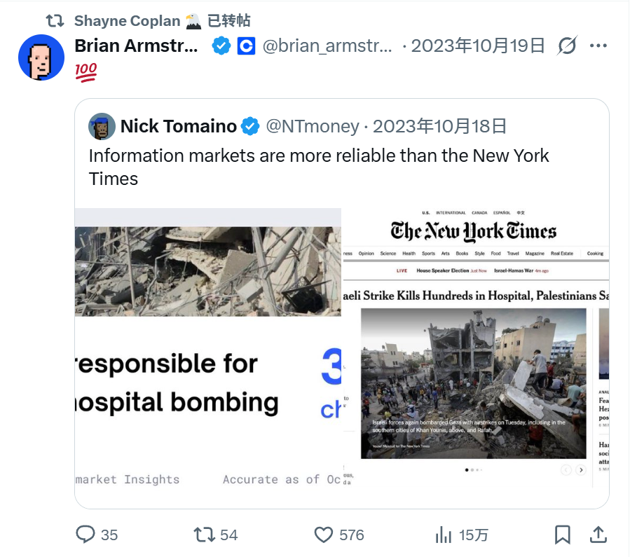 2023 年 10 月 19 日,Shayne Coplan 转发了一条帖子,原帖内容是关于以色列是否应该为巴勒斯坦医院受袭事件负责,在纽约时报的答案是应该,而Polymarket上的裁决是不应该。随后原帖主删除了该帖,而在Polymarket 上也没有找到相关记录。