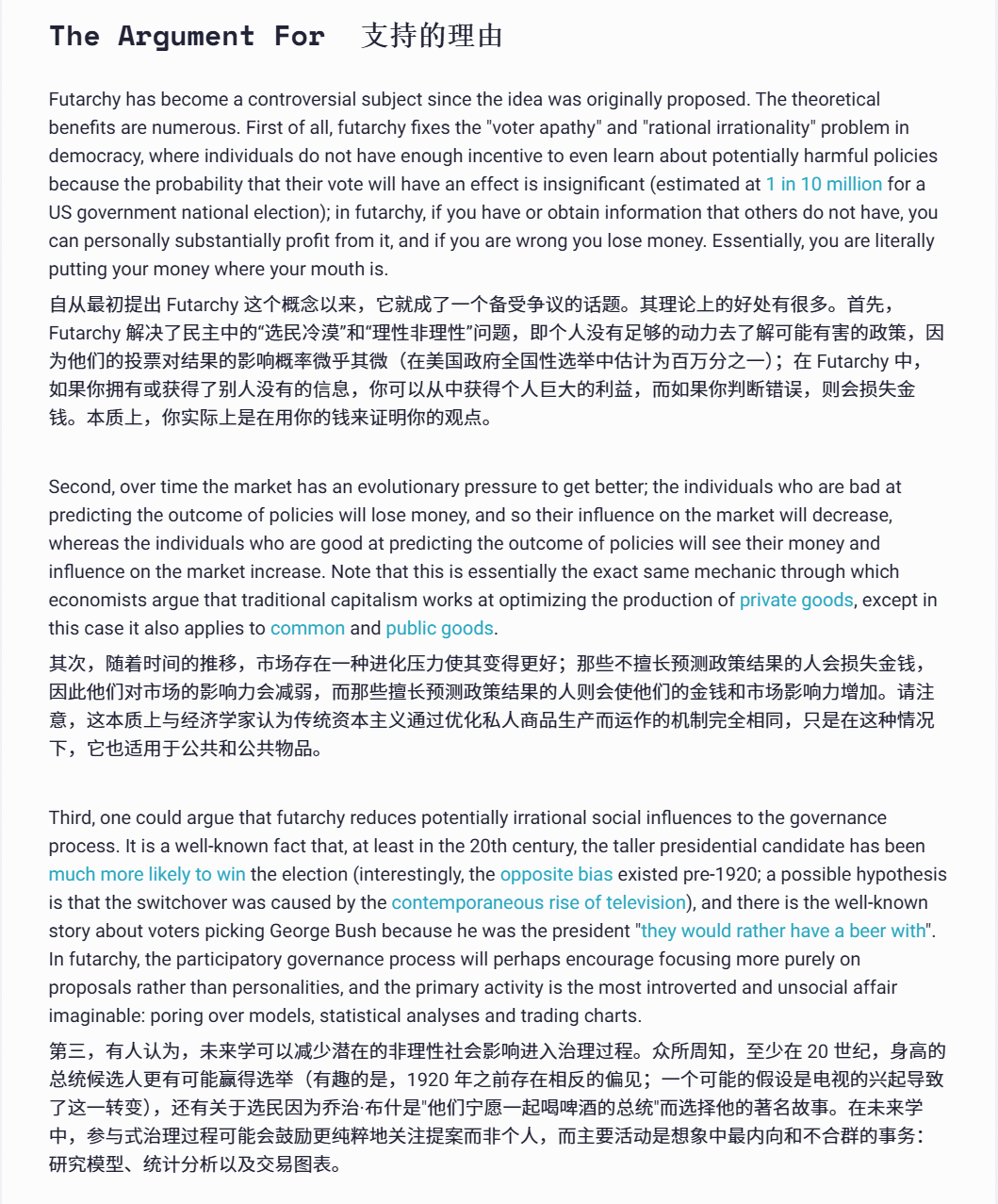经济学家罗宾·汉森在其论文《我们会对价值观进行投票,但会对信仰进行押注》中描述了一种被称为“未来政治”(Futarchy)的市场治理形式,其核心观点可被归纳为民主的投票制度将表达人民的政治意愿,但是投注市场将说出如何实现它;而当一个投注市场明确估计到一个提议的政策将增加预期的国家福利时,该提议就应该成为法律。