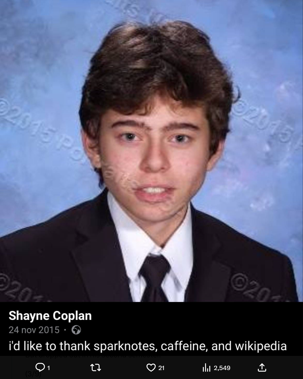 Shayne Coplan 的高中毕业总结:“我要感谢Sparknotes(一个用于复习的网站)、咖啡因和维基百科。”