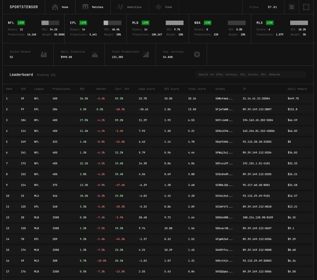 这是一个专注于「击败市场赔率」的子网,旨在挖掘全球体育博彩市场中的「优势机会」。这是一场持续性竞赛:机器学习工程师需部署模型,预测美国职业棒球大联盟(MLB)、美国职业足球大联盟(MLS)、英格兰足球超级联赛(EPL)、美国职业篮球联赛(NBA)等主流体育联赛的赛事结果,能实现盈利的「最佳模型」将获得 SN41 Sportstensor 阿尔法代币奖励。