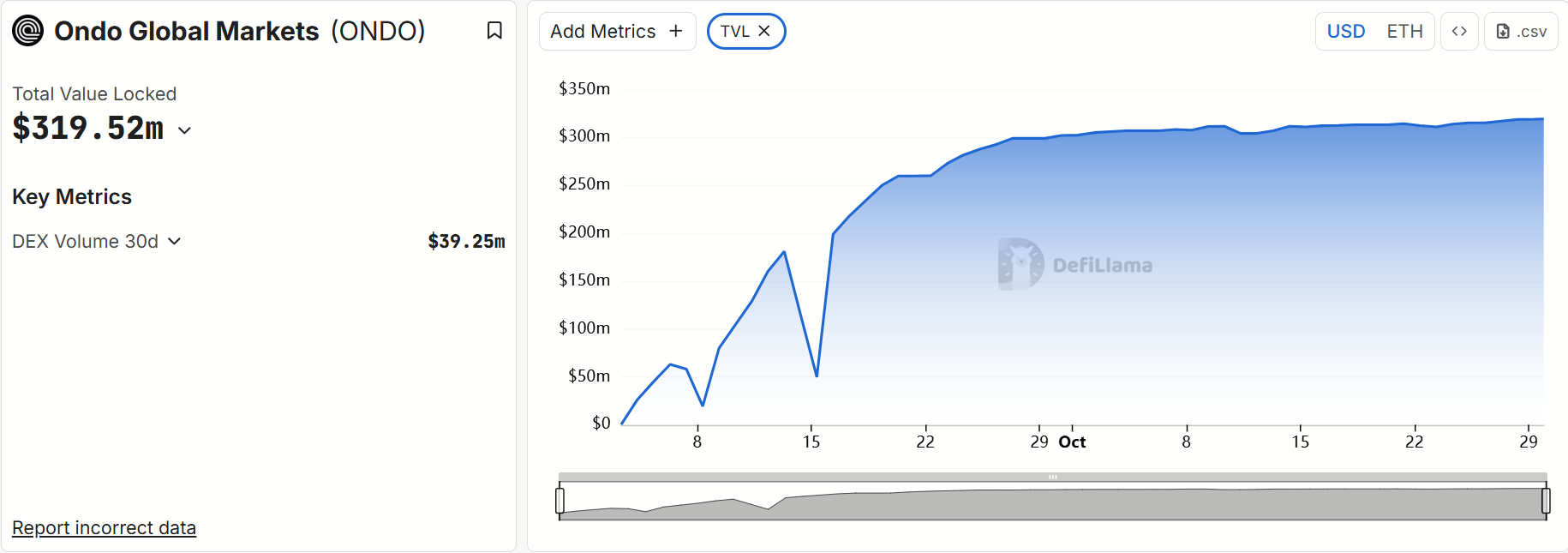 据 defillama.com 数据显示,OGM 上线仅 9 周 ,其锁定资产规模(TVL)便攀升至 3.2 亿美元 ,累计链上交易额突破 6.69 亿美元 ,支持超过 1 00 种代币化美股或 ETF ,包括 SPY、Apple、Tesla、NVIDIA、QQQ 等最具代表性的资产。