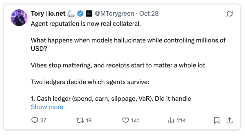 Tory 解释了 ERC-8004 更广泛的意义,「AI 代理可能造成伤害,而通过 ERC-8004,拥有‘最干净’公开记录的代理将最终胜出。」