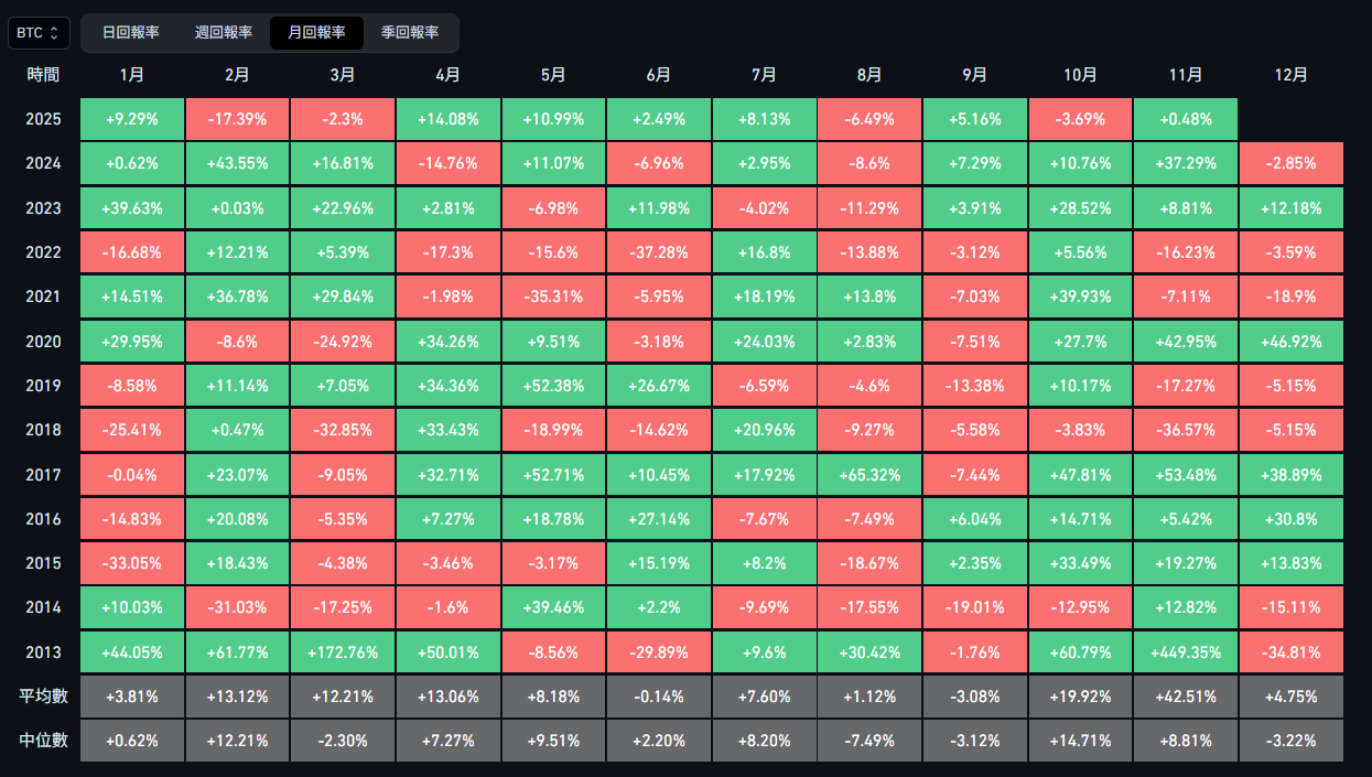 首先是季節性因素。回顧比特幣 2013 年至 2024 年的歷史數據,11 月向來是比特幣在一年中表現最強勢的月份,平均漲幅高達 42.5%。若這一歷史模式重演,以目前約 11 萬美元的價格為基準,比特幣仍有機會挑戰 15 萬美元甚至更高的價格。