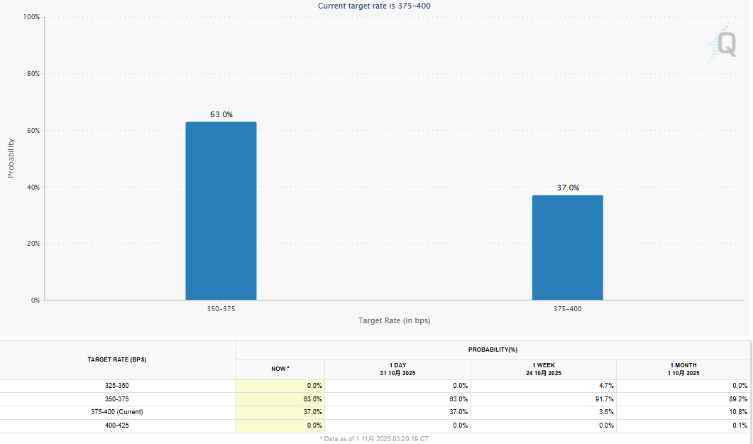 其次,聯準會已正式宣告 12 月初將終止縮表,且市場雖然認為鮑爾的講話降低了 12 月的降息預期,但市場仍認為 12 月有 63% 的機率降息。