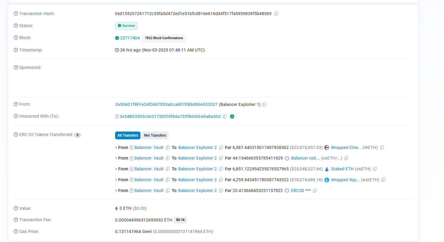 11月3日,DeFi世界的天空被撕开了一道口子。老牌DeFi协议Balancer的金库地址出现异常的大额资金转移 。随后的几个小时里,整个行业目睹了一场灾难的实时上演,受损资金从最初报告的7000万美元一路上升至1.166亿美元 ,最终稳定在1.2864亿美元的惊人数字。