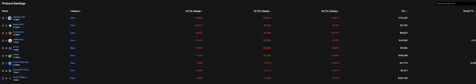 根据Defillama的数据显示,在攻击发生后,Balancer的TVL直接从7.76亿美元下降至3.45亿美元,降幅超过一半。尤其是Balancer V2的TVL直接减少了2.3亿美元,Balancer V2的分叉协议也纷纷撤出资金池,其中Gaming DEX的TVL在一天内下降了87%,Beets DEX则下降了48%。