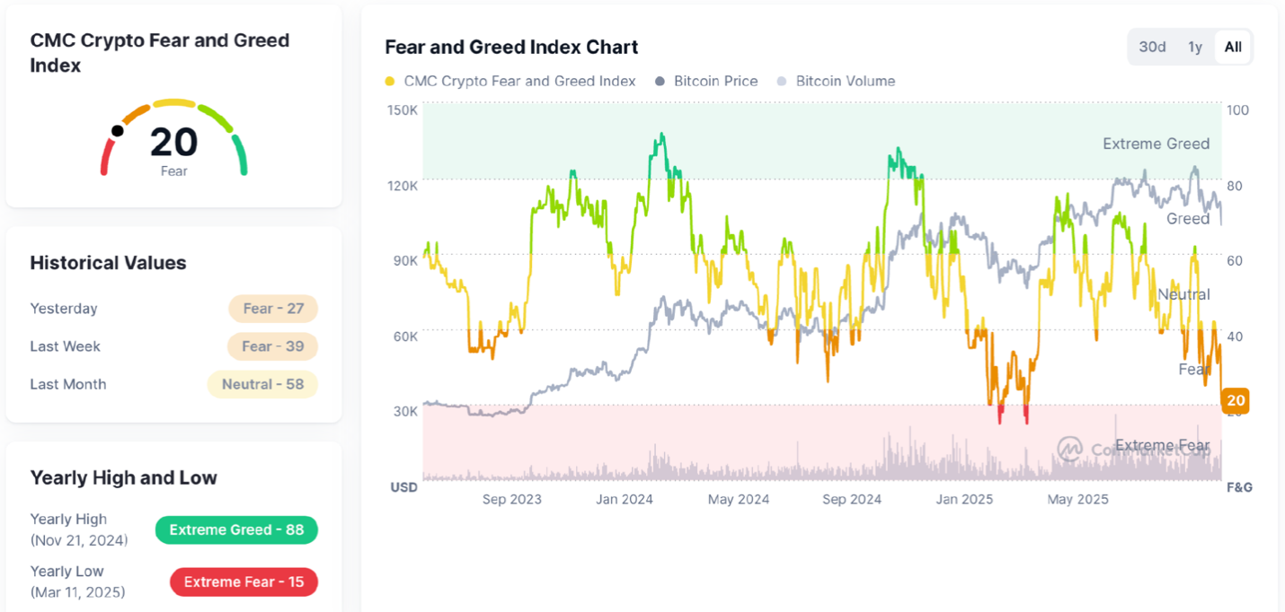 当前加密市场情绪指数(Fear & Greed Index)= 20,处于明显恐惧区间,较上周和上月持续走弱。结合图表可见:比特币价格在过去数月经历高位回落,市场情绪从“贪婪”急转“恐惧”,伴随成交量下降,显示资金观望、风险偏好降低。但此区域同时回到了历史上多次对应 中期底部或价值布局区间——情绪越差,长期资金越可能开始累积。换句话说:短期悲观、波动加剧;中长期,对逆向资金而言,恐惧区往往孕育机会。