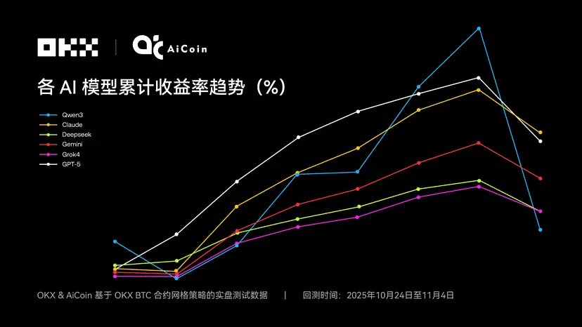 有意思的是,近期 OKX AiCoin 联手搞的六个 AI 模型实盘测评,不盯着短线炒币那套,而是把目光放在了合约网格策略上,偏偏就是这个选择,挖出了 6 AI 模型的真实收益表现: 在合约网格策略里, AI 实现了 群体生存 ”—— 所有模型都拿到了正收益。这意味着, AI 模型或更适合中性、系统化的网格策略,而非短线追涨杀跌。