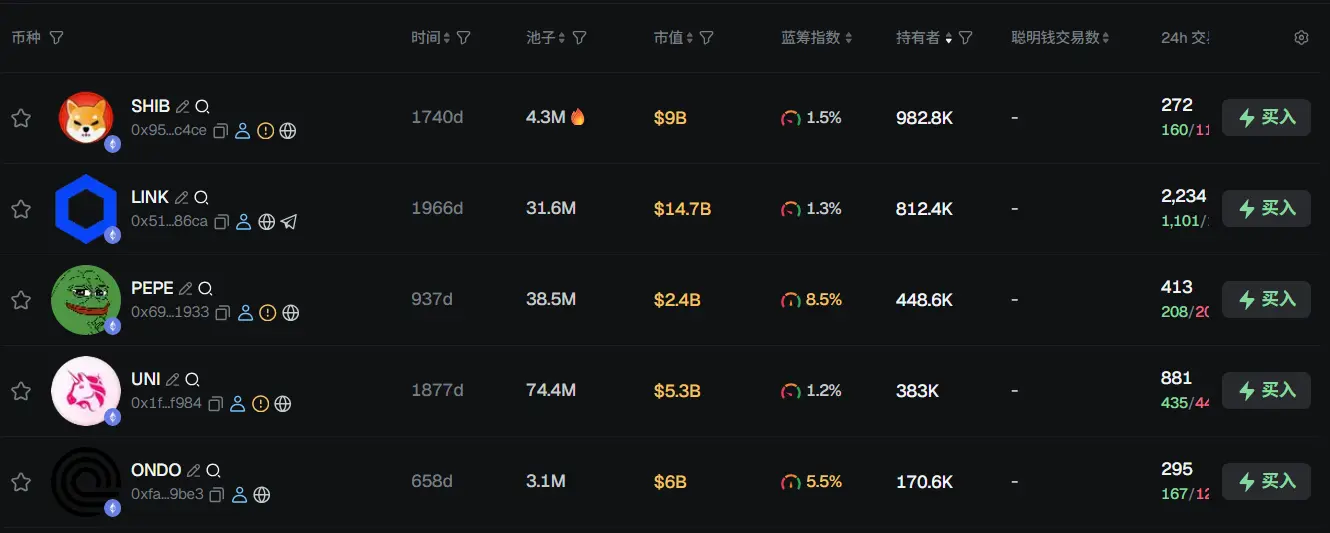 过去 24h ETH 热门代币前五依次为:SHIB、LINK、PEPE、UNI、ONDO