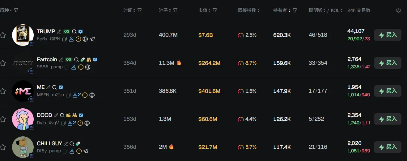 过去 24h Solana 热门代币前五依次为:TRUMP、Fartcoin、ME、DOOD、CHILLGUY