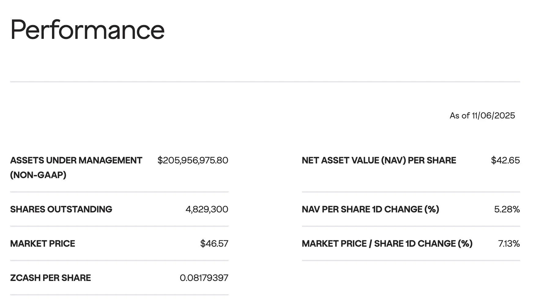 数据显示,ZCSH 的 AUM(管理资产规模)在一个月内暴增 228%,从约 4,200 万美元增至 1.36 亿美元,占 ZEC 流通量的约 1.9%。对于一个日均成交量数亿美元的资产而言,近 2% 的筹码被长期锁定在信托中,供给端的紧缩效应显著。