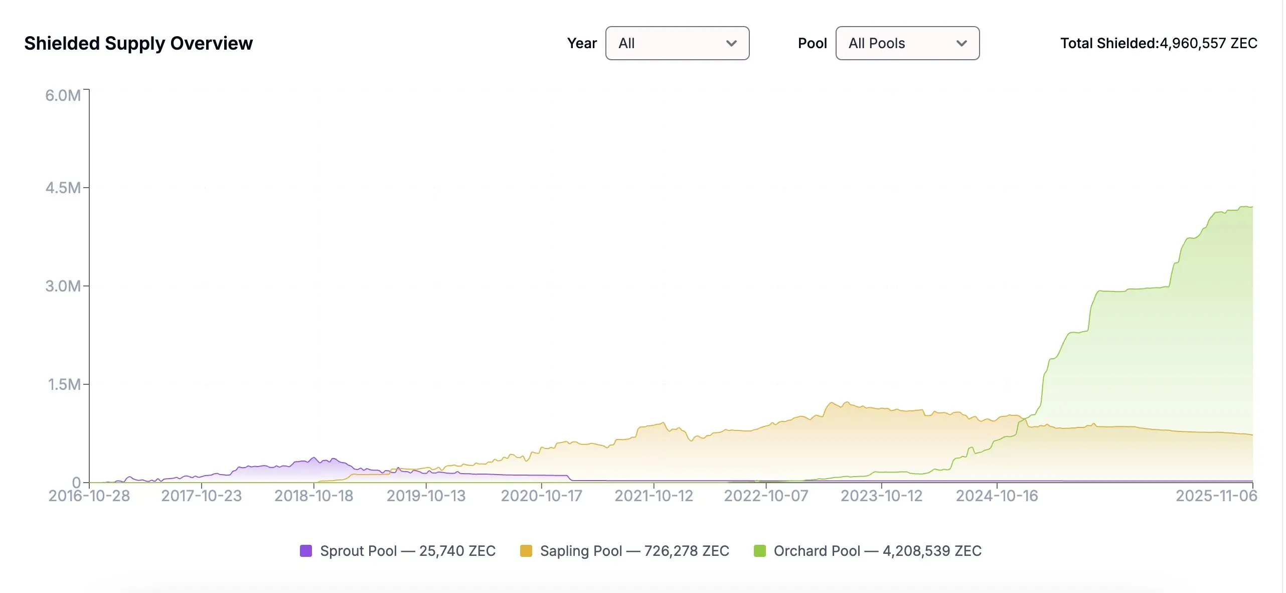 ZEC 屏蔽池余额在 40 天内从 400 万枚增长至 490 万枚,增幅达 25%;屏蔽交易占比从不足 10% 跃升至 25-30%,这意味着越来越多用户选择完全匿名的交易方式。而用户越多,隐私保证越强,网络效应也就越明显。