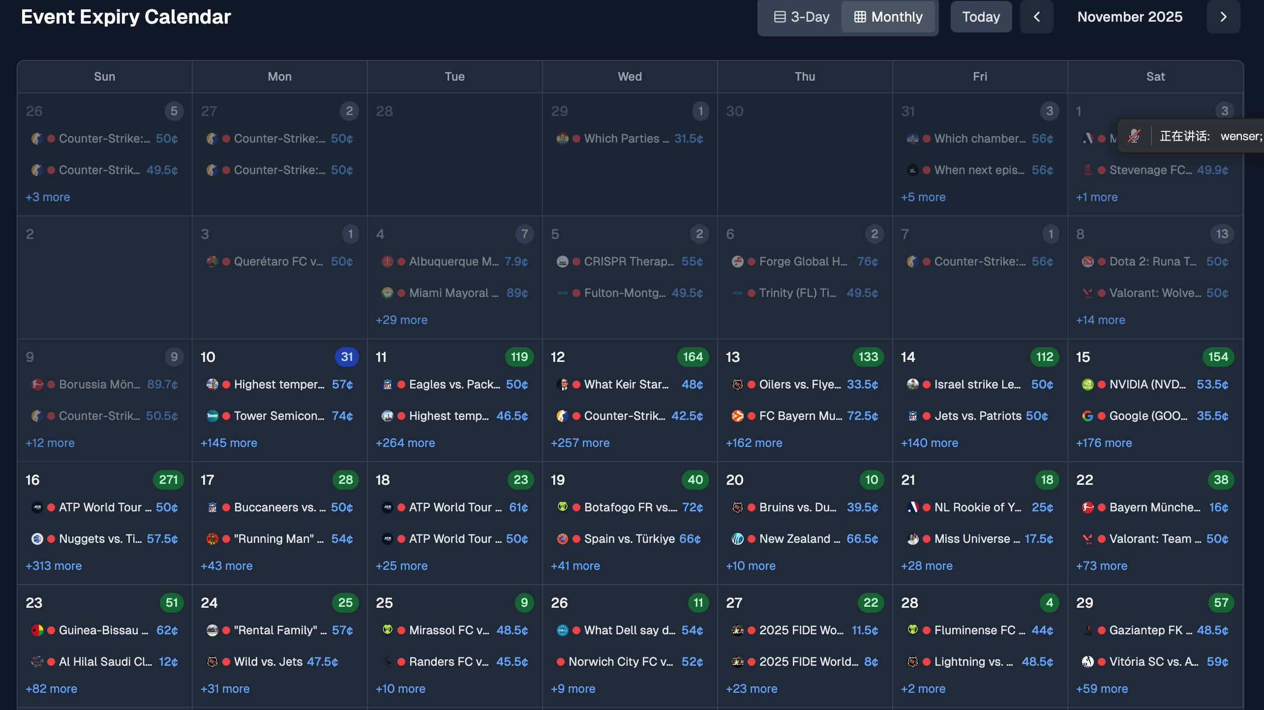 日历板块在我看来很实用,可以筛选后很直观的看到你想获得的预测市场。