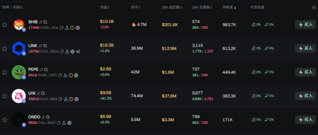 过去 24h ETH 热门代币前五依次为:SHIBLINKPEPE、UNI、ONDO