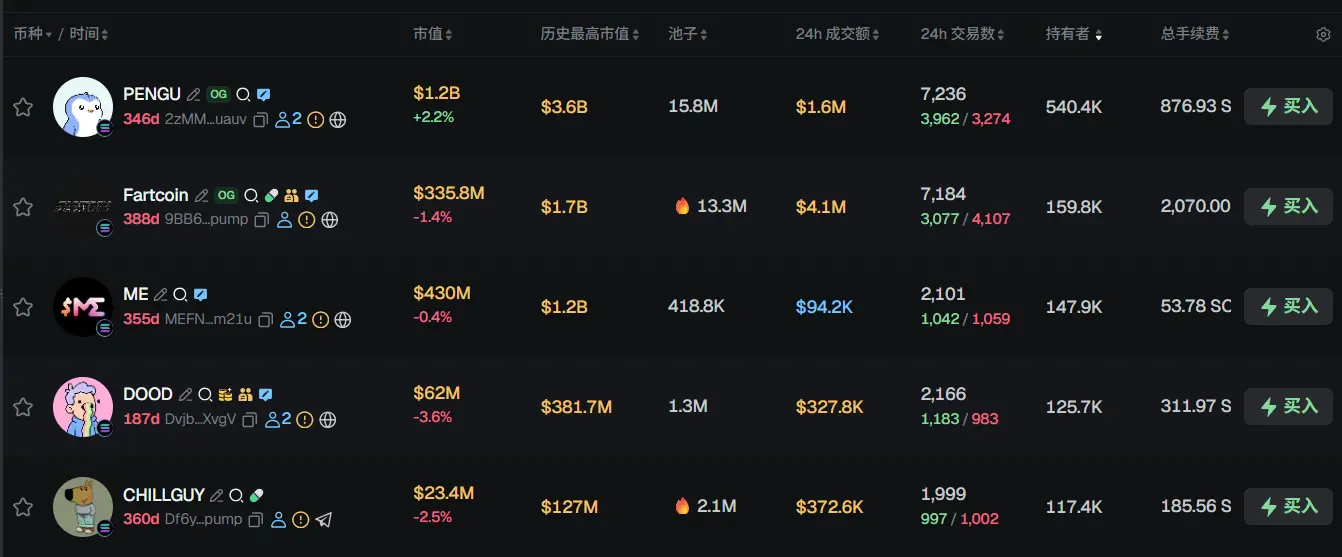 过去 24h Solana 热门代币前五依次为:PENGU、Fartcoin、ME、DOOD、CHILLGUY