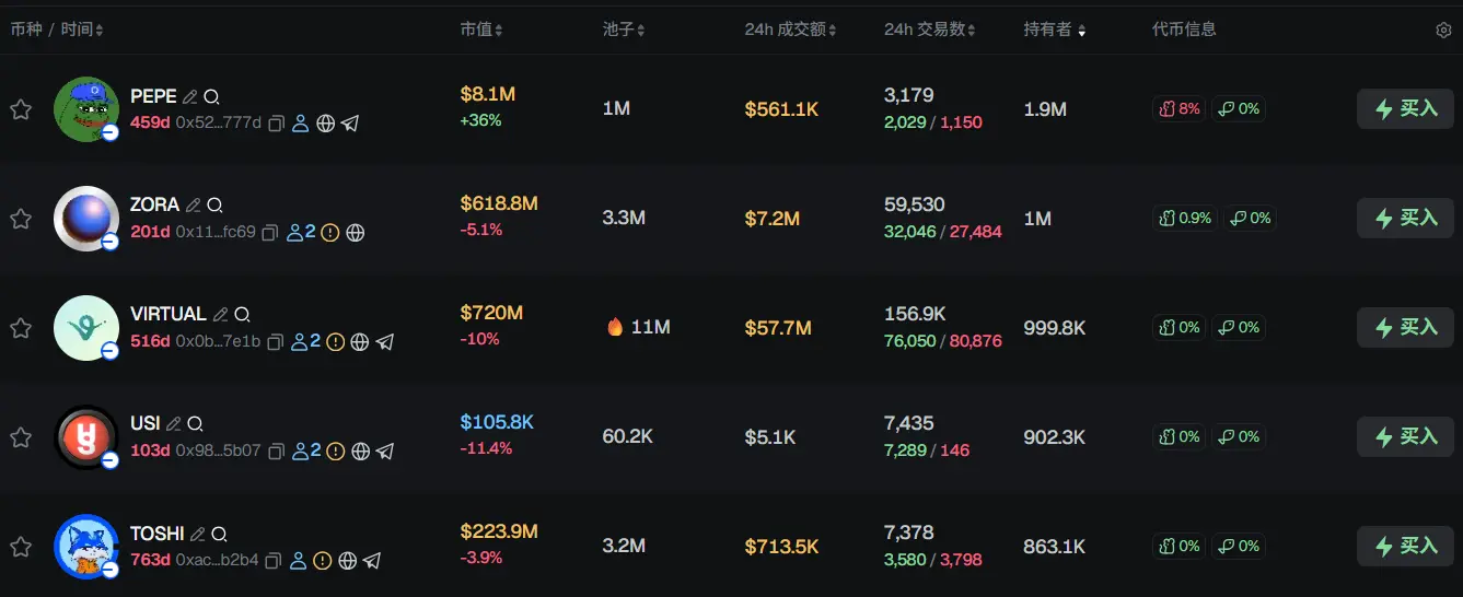 过去 24h Base 热门代币前五依次为:PEPE、ZORA、VIRTUAL、USI、TOSHI