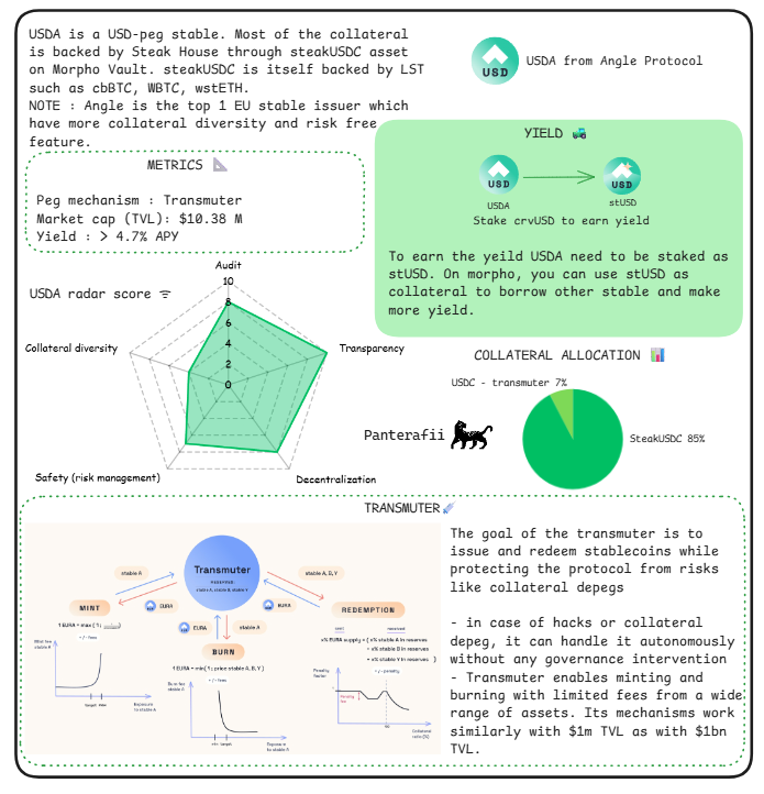 具体风险 :USDA 的转换器目标是通过允许以有限费用(如 1 百万美元 TVL 和 10 亿美元 TVL 相同)进行铸造/销毁来防止脱锚,但这也引入了自治性风险,例如治理在无干预情况下的运作,使其易受黑客攻击或其 85% steakUSDC 支持的抵押品失效的影响。