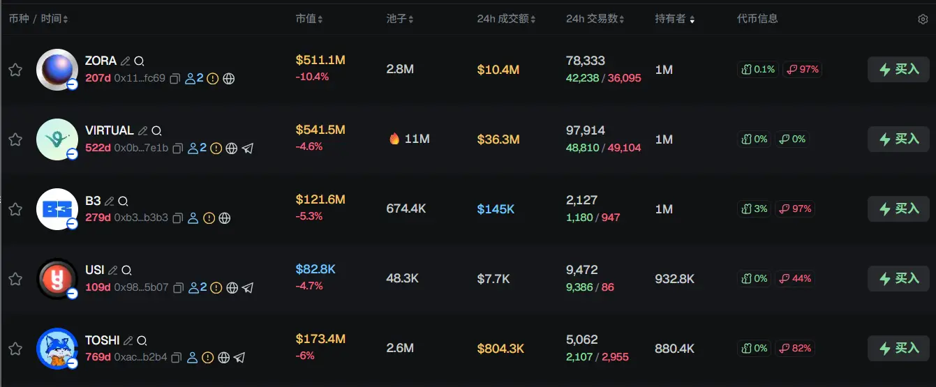 过去 24h Base 热门代币前五依次为:ZORA、VIRTUAL、B3、USI、TOSHI