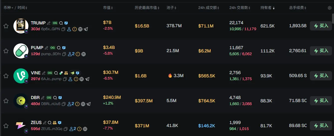 过去 24h Solana 热门代币前五依次为:TRUMP、PUMP、VINE、DBR、ZEUS