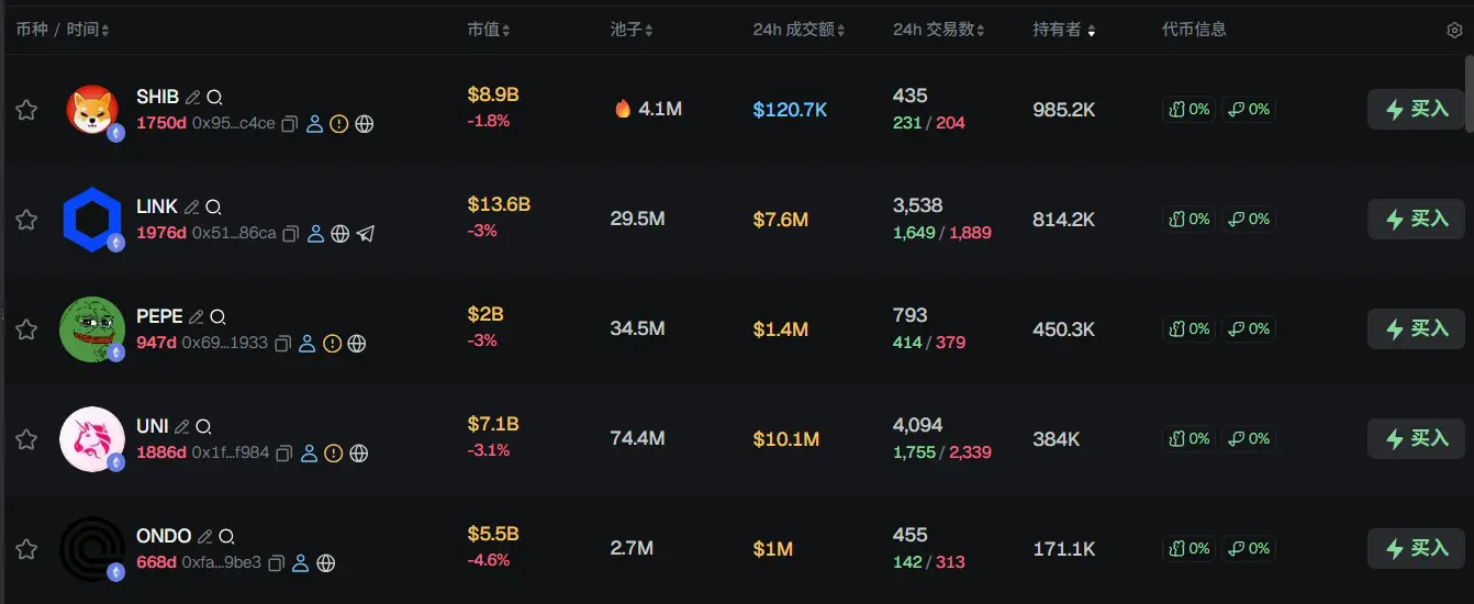 过去 24h ETH 热门代币前五依次为:SHIB、LINK、PEPE、UNI、ONDO