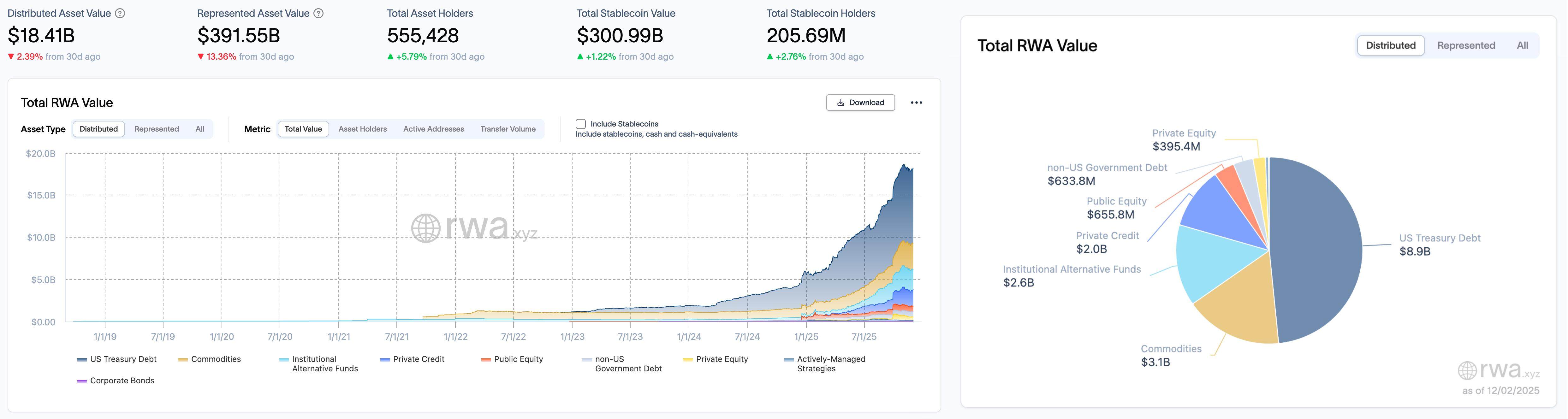 据 rwa.xyz 数据面板,截至 2025 年 12 月 2 日,RWA 链上总价值(Distributed Asset Value)或受到统计口径收窄等缘故,从 11 月 25 日的 360.1 亿美元骤降至 184.1 亿美元,单周蒸发约 176 亿美元,跌幅高达 48.8%,出现腰斩式回落。尽管资产净值出现大幅波动,但资产持有者总数却呈现逆势增长态势,从 549,443 人增加至 555,428 人,单周新增 5,985 人,增幅约 1.09%。稳定币市场表现依旧稳健且强劲,总市值成功突破 3000 亿美元大关,从 2982.4 亿美元攀升至 3009.9 亿美元,增长 27.5 亿美元,涨幅 0.92%;稳定币持有者数量继续稳步扩张,由 2.0433 亿人上升至 2.0569 亿人,增加约 136 万人。