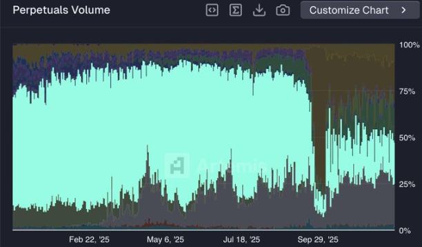 自 2025 年 5 月起,Hyperliquid 市场份额急剧下滑,截至 12 月初,其交易量占比已从约 80% 跌至接近 20%。