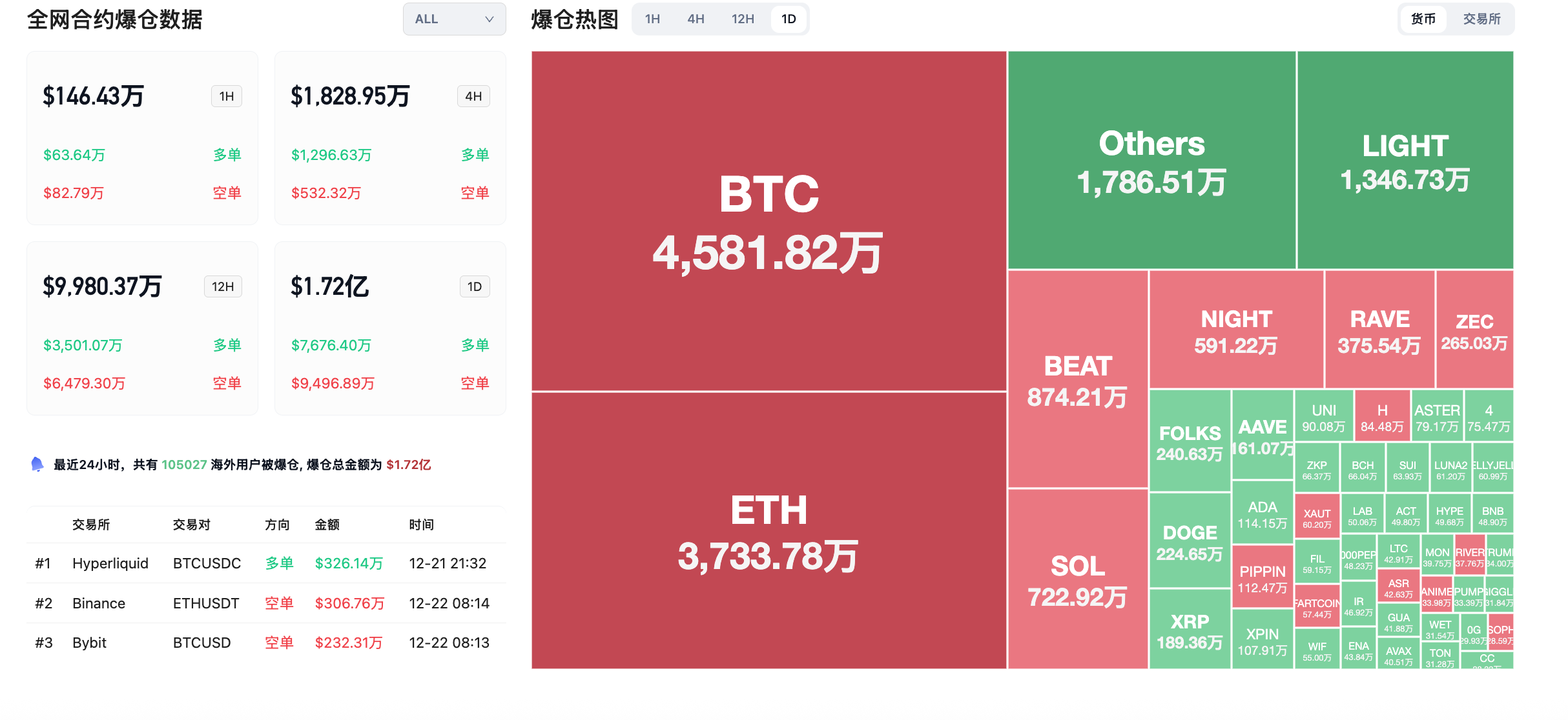 • 24小时爆仓数据:全球共105027人被爆仓爆仓总金额为1.72亿美元,其BTC爆仓4581.8万美元、ETH爆仓3733.78万美元、SOL爆仓722.9万美元