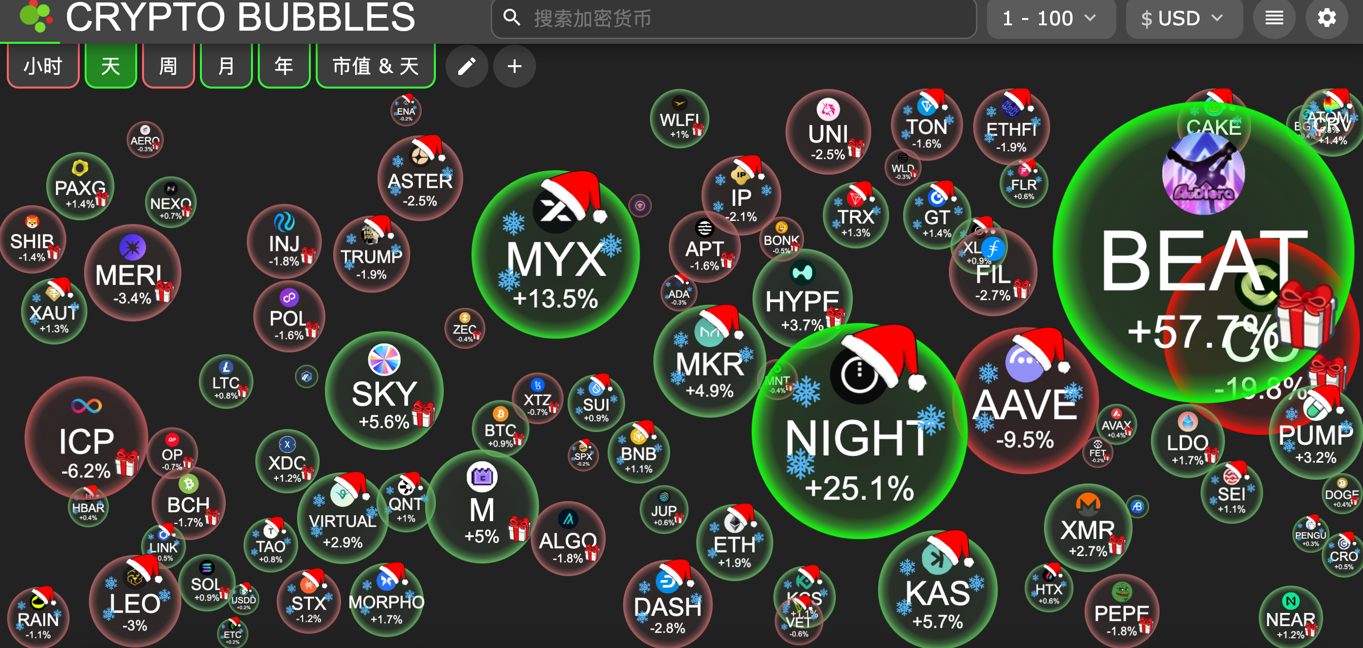 今日市值前100币种最大涨幅:Audiera涨57.7%、Midnight涨25.1%、MYX Finance涨13.5%、Kaspa涨5.7%、Sky (prev. Maker)涨5.6%。