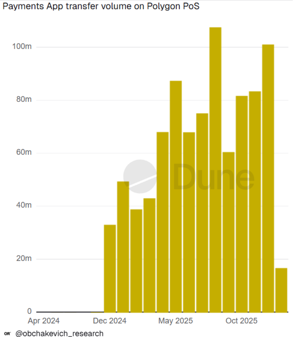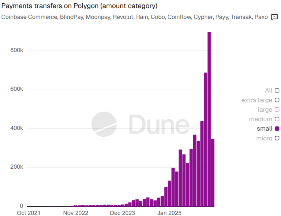 Onchain研究负责人Leon Waidmann强调, 这一交易区间与日常信用卡消费高度重合,表明Polygon正在逐渐成为支付网关与PayFi(支付金融)的主要通道。