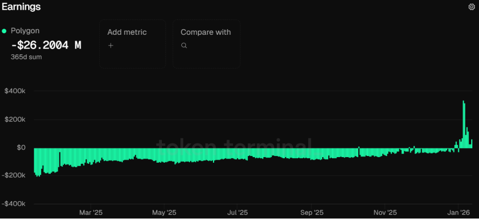 4. 财务上的可持续性隐忧:Token Terminal数据显示,Polygon在过去一年净亏损超2,600 万美元,其手续费收入难以覆盖验证者成本。这种对生态激励的依赖意味着它依然处于“烧钱换市场”的阶段。即便进入2026年,Polygon已扭亏为盈,其造血能力的可持续性也仍有待观察。