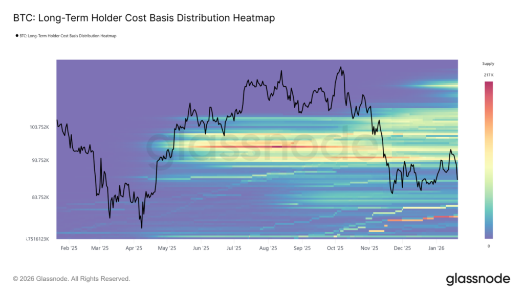 長期持有者成本基礎分佈熱力圖顯示,在當前現貨價格上方,存在一個密集的長期持幣成本區。當價格反彈至這些歷史買入價位時,該區域代表了巨大的潛在賣方流動性。