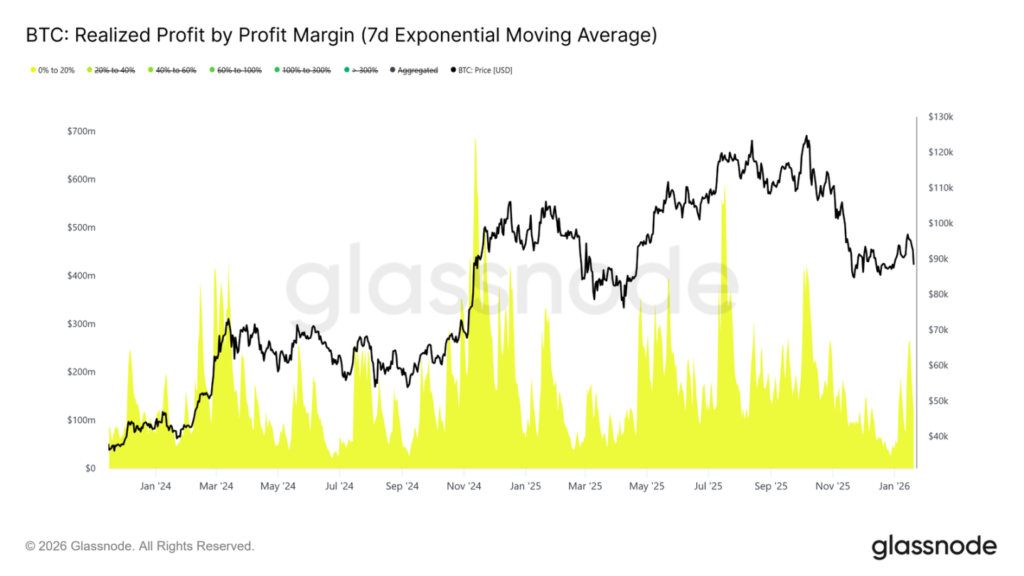 與此同時,按利潤率劃分的實現利潤資料表明,利潤率在 0% 至 20% 區間的獲利了結佔比顯著上升。這凸顯了「盈虧平衡賣家」和短期波段交易者的影響,他們傾向於小幅盈利即離場,而非等待趨勢延續。