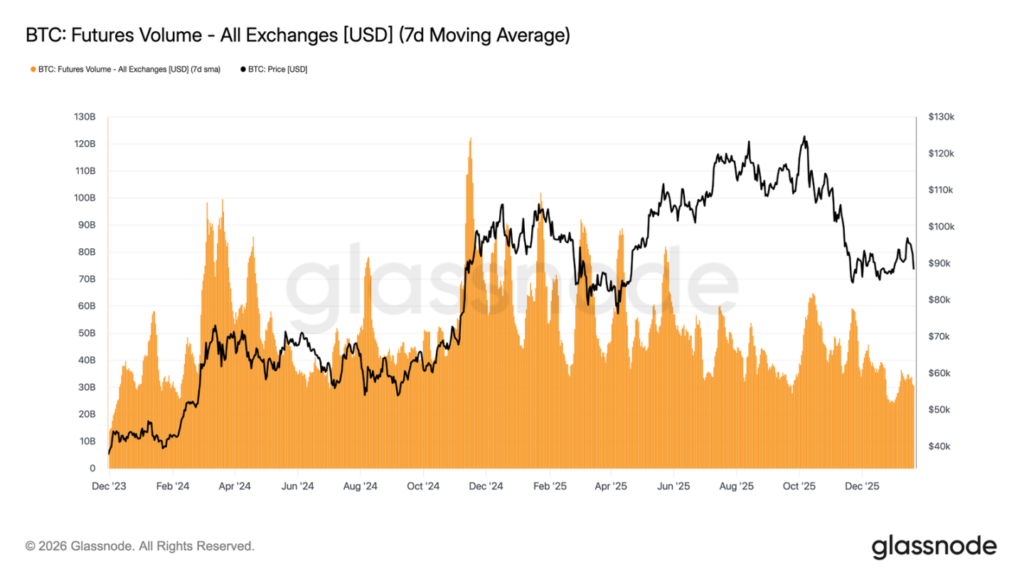比特幣期貨的 7 日移動平均交易量持續萎縮,遠低於通常與趨勢行情相伴的水平。近期的價格波動並未伴隨交易量的有效放大,凸顯出衍生品市場參與度低、信心不足的特點。
