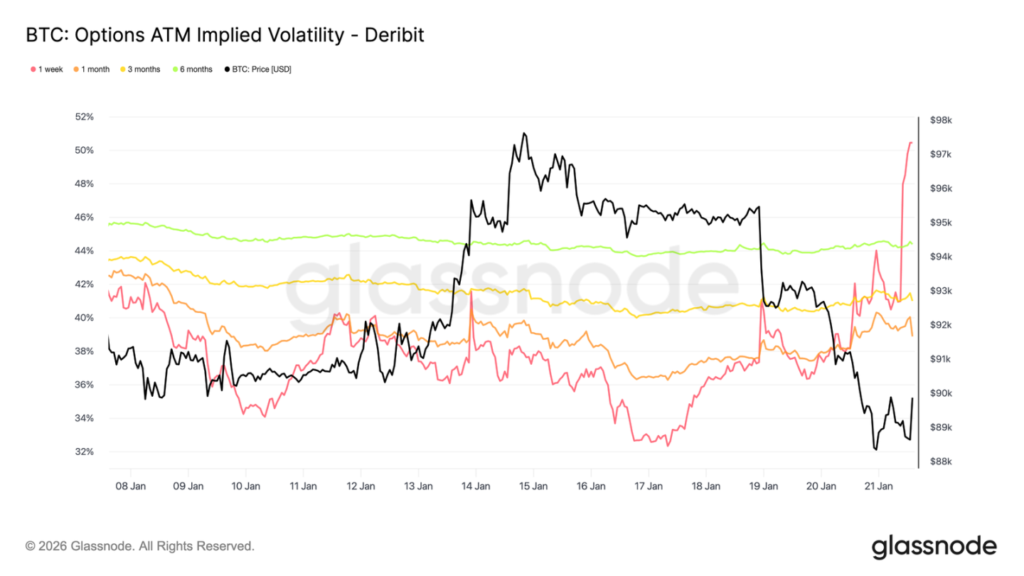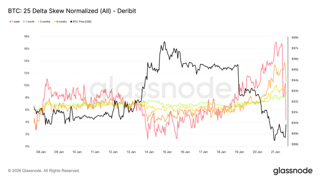 偏度如此劇烈的傾斜通常伴隨區域性極端行情,此時市場倉位擁擠,難以延續原趨勢。在達沃斯論壇相關言論影響被市場消化後,下跌方向的溢價已被部分獲利了結,偏度開始迅速回撤。