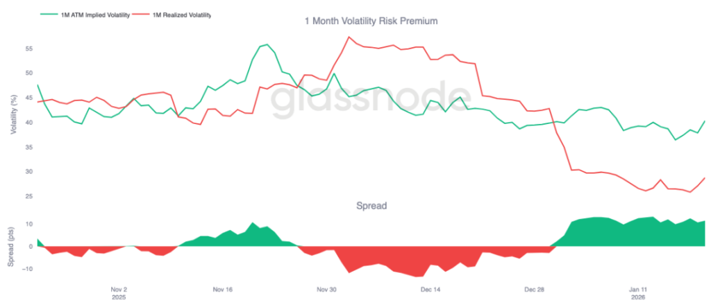 這種動態會自我強化,抑制波動率上升。只要賣出波動率有利可圖,就會有更多參與者加入,從而將隱含波動率壓制在較低水平。截至 1 月 20 日,一個月期波動率利差約為 11.5 個波動率點,有利於賣方,這充分說明了當前環境對賣出波動率行為依然友好。