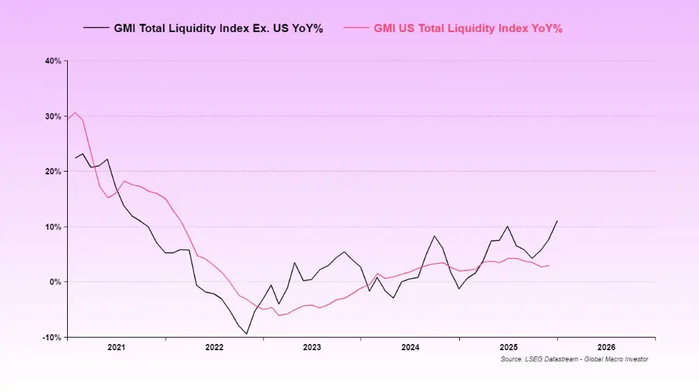 我们在 GMI 的错误判断是没有看到美国流动性是当前的驱动因素,而通常在整个周期中是全球总流动性占主导地位。但现在很清楚了,这仍然是“万物代码”在起作用…… 并不存在脱钩。只是各种事件的汇合——逆回购耗尽 > TGA 重建 > 停摆 > 黄金上涨 > 停摆——是我们无法预测的,或者无论如何我们错过了其影响。