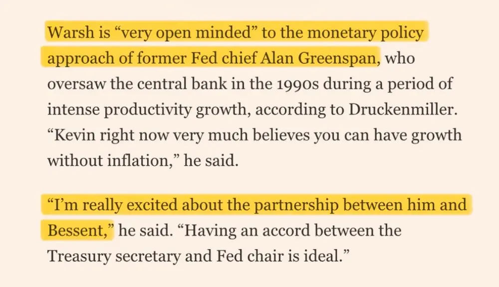 Warsh 的工作和他的任务是运行格林斯潘时代的剧本。特朗普说过这点,Bessent(财政部长提名人)也说过。这里篇幅太长无法展开,但这意味的是:降息,让经济过热,并假设 AI 带来的生产力提升会压制核心 CPI。就像 1995 年到 2000 年那个时代一样。