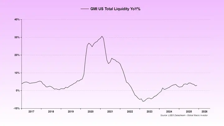 这个因素就是:由于两次政府停摆以及美国金融“管道”的问题(逆回购工具在 2024 年基本已耗尽),美国流动性一直受到抑制。因此,7 月和 8 月的 TGA(财政部一般账户)重建没有得到货币层面的抵消。结果就是流动性的枯竭……