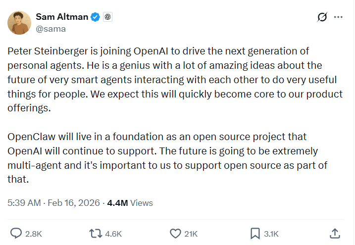 “Peter Steinberger加入OpenAI是为了推动下一代个人智能体(personal agents)的开发。” Altman写道, “我们预计这将很快成为我们产品供应的核心。”