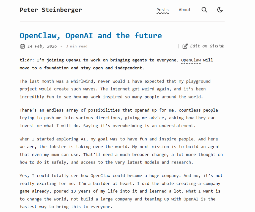 Steinberger坦言: “最终,我觉得OpenAI是继续推动我的愿景并扩大其影响力的最佳场所。”