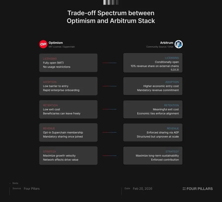 Optimism 在 MIT 许可证下完全开源代码,并对加入“超级链”的链实行收益共享模式。Arbitrum 采用“社区源码”模式,要求基于 Orbit 构建的链若在 Arbitrum 生态系统之外结算,需贡献 10% 的协议收入。