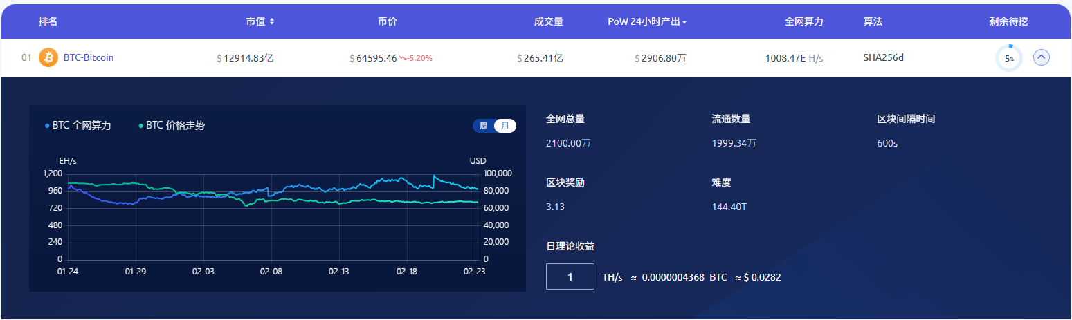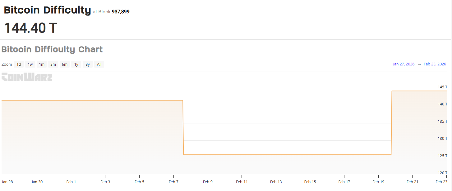 根据这两天的数据,比特币网络难度在2月19日当天从125.86T飙升到144. 39T,难度涨幅达14.72%。这是自2021年5月以来的最大单次上调幅度。这次难度调整直接抹平了矿工在今年早些时候获得的所有运营喘息空间。网络难度的剧增意味着矿企需要投入更多的算力和电力成本,才能维持原有的产出份额。