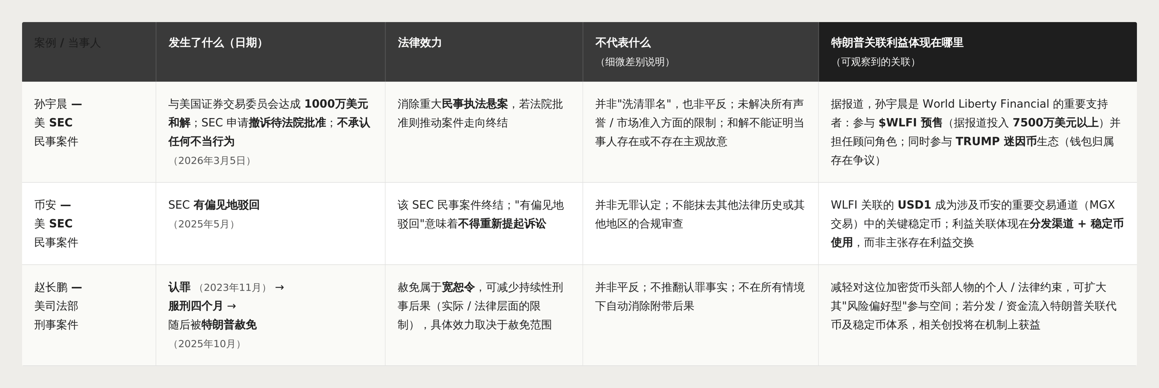 孙宇晨的和解终结了民事欺诈案,但并非无罪认定。币安的 SEC 民事诉讼以不得重诉的方式撤销。CZ 的赦免是司法宽赦,不是对其认罪的事实推翻。