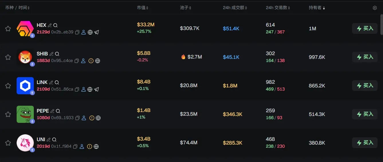 过去 24h ETH 热门代币前五依次为:HEX、SHIBLINKPEPE、UNI