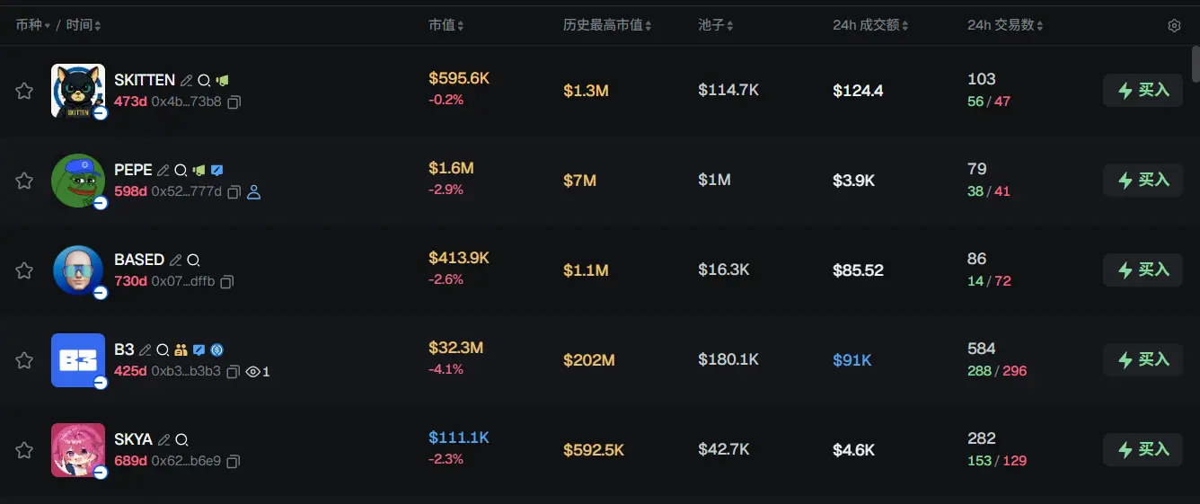 过去 24h Base 热门代币前五依次为:SKITTEN、PEPE、BASED、B3、SKYA
