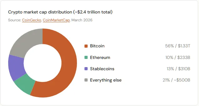 比特币占据加密市场每一美元中的约56美分。加上以太坊和稳定币,占比达到79%。前10大代币合计占总市值约90%。剩余约2300亿美元分散在数千万个其他代币中。
