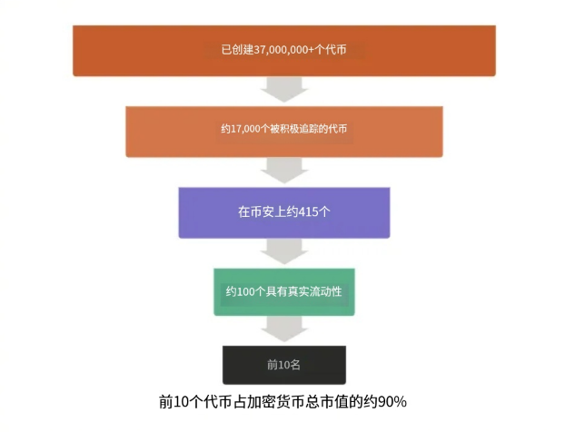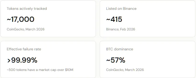CoinGecko追踪约17,000个代币,币安上架415个。"存在"和"有实质性流动性"之间的差距是天壤之别。