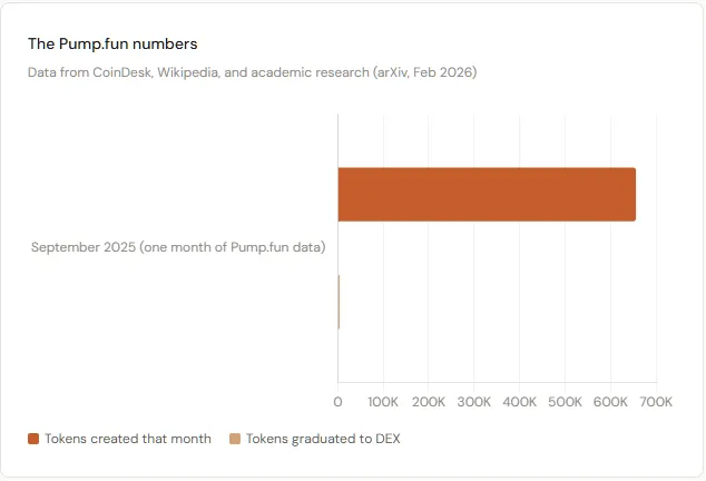 2026年2月发表的一篇研究论文对 Pump.fun 一个月的数据进行了分析:2025年9月,243,123个不同钱包地址共创建了655,770个代币,其中只有4,338个"毕业"上了去中心化交易所,毕业率0.63%。