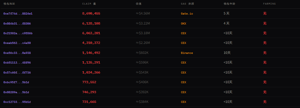 进一步梳理可以发现,图中地址的链上行为上高度一致,均为新建 EOA 账户(4 至 10 天内新创建),缺乏历史交易与 DEX 交互记录,在空投开放后短时间内集中完成空投代币申领操作,且 Gas 资金来源集中于 Gate.io、OKX、Binance 等交易所热钱包,这类路径通常与机构或团队资金调度方式相符。