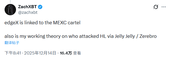 此外,链上侦探 ZachXBT 还 发现 ,edgeX 与 MEXC 的做市地址存在链上关联,并推测与此前攻击 Hyperliquid 的 Jelly Jelly、Zerebro 事件有关,当时曾导致其单日 TVL 损失约 2 亿美元。与此同时,MEXC 官方博客持续为 edgeX 做推广,并上线盘前交易,两者关系显然已经超出普通合作范畴。